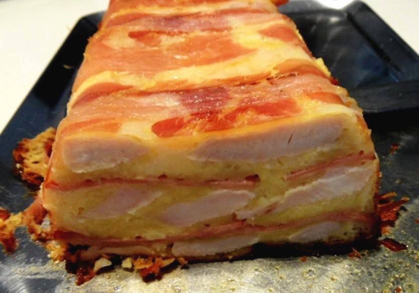 Az én receptem:70dkg csirkemell,20dkg sajt,4ek tejföl,2ek liszt,2db tojás,25dkg bacon szalonna,só,bors,izlés szerint,zöldség zöld, kevés margarin a tepsit kivajazni.